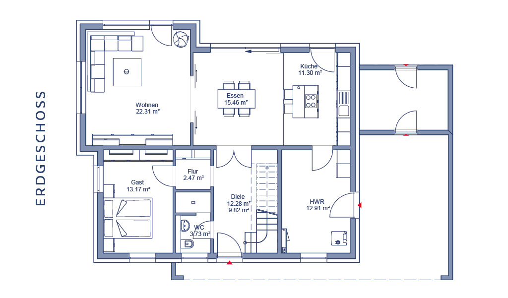• Schwellenlose Zugänge zum Haus (Haus- und Terrassentür)